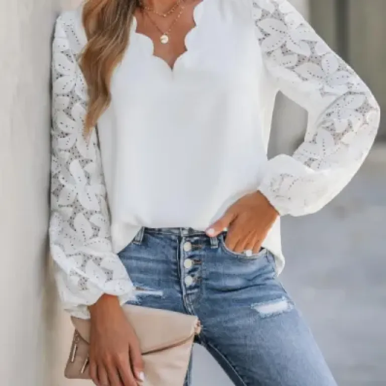 Niveau design, le premier truc qu’on voit, c’est la dentelle florale et le col en V festonné. Visuellement, ça rend plutôt bien. Porté avec un jean brut ou un pantalon noir, ça fait un style habillé mais pas guindé. Le blanc est assez net, pas crème ni grisâtre, donc ça passe bien pour un look simple et propre. Le col en V n’est pas trop plongeant, donc tu peux le mettre au boulot sans te prendre la tête sur ce que ça montre.