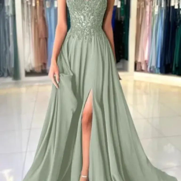 Le modèle que j’ai pris : couleur vert, taille 40, coupe longue jusqu’au sol, avec une fente sur le côté. Le haut est en dentelle avec quelques paillettes, l’encolure en V est plutôt marquée mais pas vulgaire, et les bretelles sont fines type spaghetti. Au dos, il y a un laçage façon corset, ce qui permet d’ajuster un peu la largeur du buste. Il y a aussi un soutien-gorge intégré, donc en théorie on peut la porter sans vrai soutien-gorge, même si ça dépend clairement de la poitrine de chacune.
