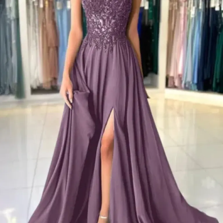 Sur la fiche Amazon, la robe est vendue comme une « robe de soirée chic et elegant » (oui, avec ce genre de formulation) en mousseline avec dentelle florale et paillettes. On nous parle d’encolure en V, bretelles spaghetti, taille haute, coupe trapèze, robe longue jusqu’au sol, soutien‑gorge intégré et laçage dans le dos. En gros, la promesse c’est la robe de demoiselle d’honneur ou d’invitée de mariage qui fait habillée sans être trop tape‑à‑l’œil. La couleur que j’ai prise c’est le violet (A Violet), qui sur les photos paraît assez profond et un peu style robe de bal.